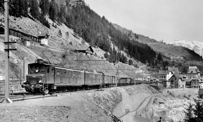 Die 11851 mit einem langen Güterzug am Gotthard. © SLM Werksfoto / Slg. Eisenbahnstiftung