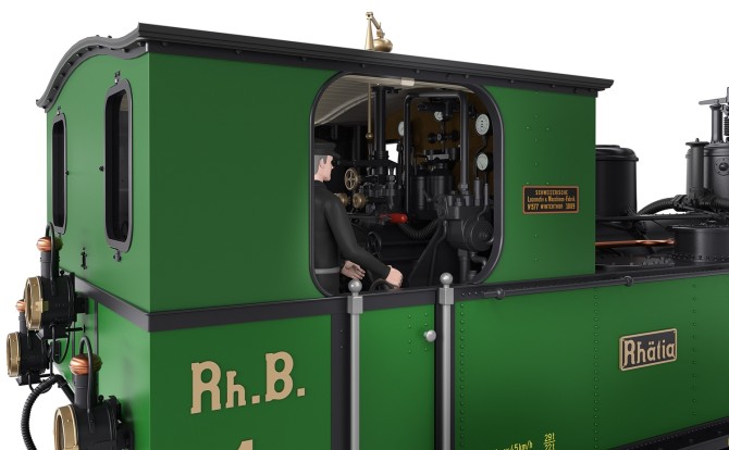 Modell der Lok 1 "Rhätia" der RhB im Zustand als Museumsfahrzeug in grün/schwarzer Farbgebung. Die Lok kehrte 1988 zum 100 jährigen Jubiläum zu RhB zurück, nachdem sie 1970 an die Museumsbahn Blonay–Chamby verkauft worden war. Die Lok wurde so bis ins Jahr 2014 vor Sonderzügen eingesetzt.